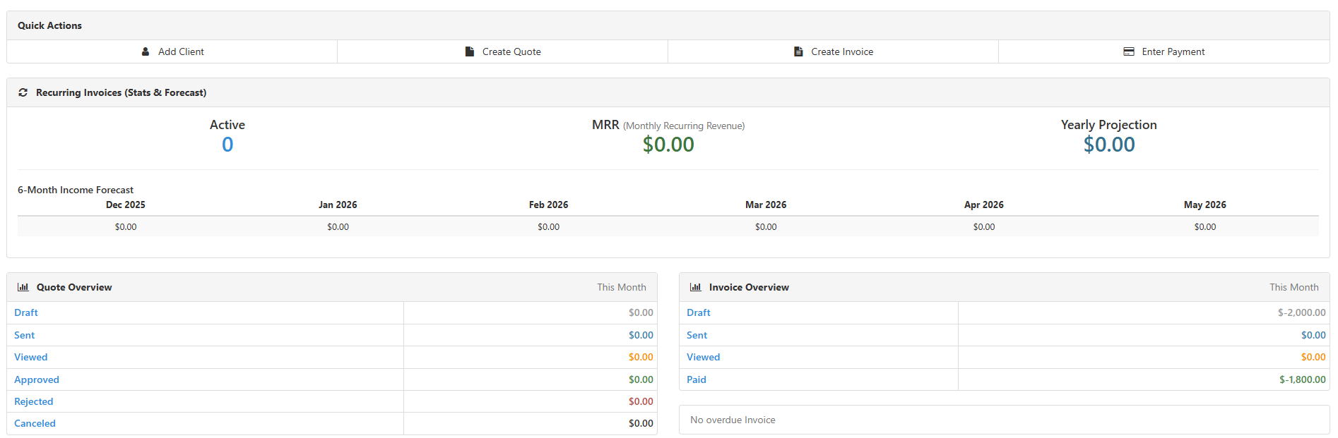 If you would like to have a widget on your dashboard to view recurring invoice stats and forecast on recurring invoices you can download the addon here:
